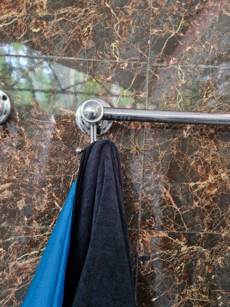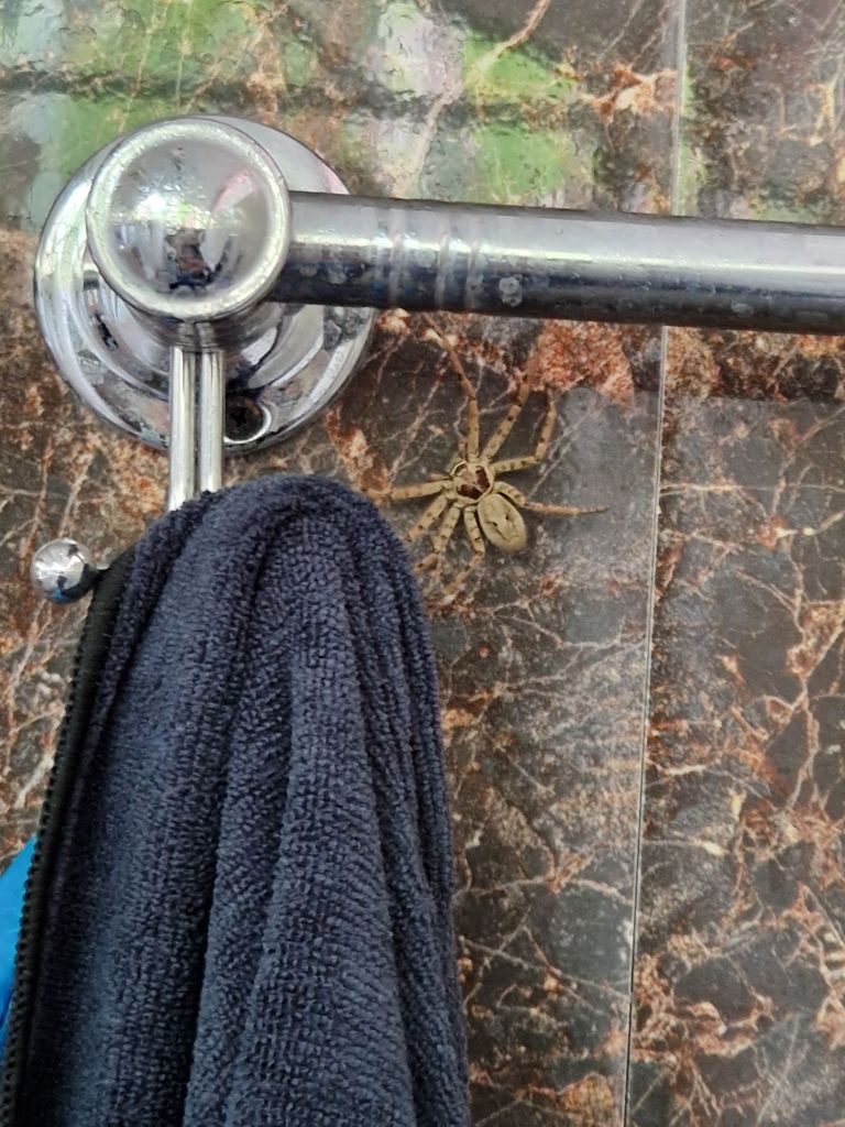 Hämtade min tvätt från duschen som jag hängde inne för att den inte skulle bli ännu blötare i regnet. Men i min handduk satt en megastor spindel!!